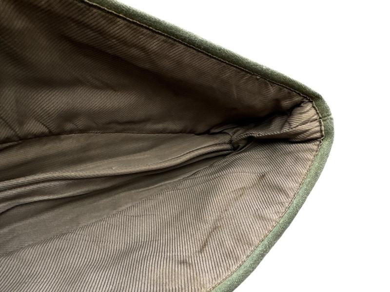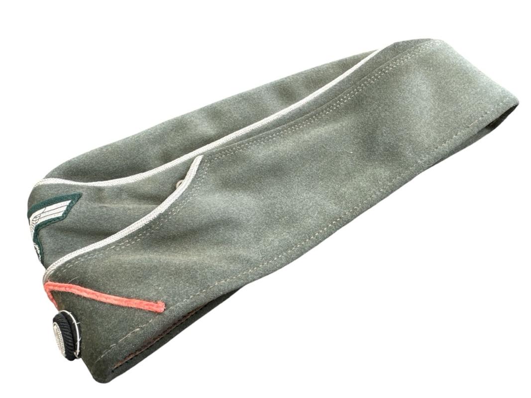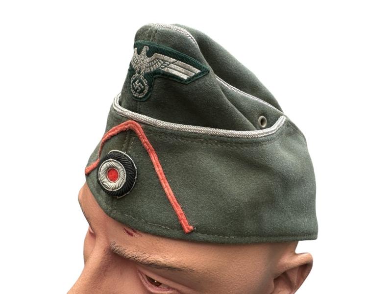 M34 pattern privately purchased officers overseas cap (Schiffchen für Offiziere) for a member of a Panzer(Jäger) unit. Genuine applied insigia up front, surrouned by a pink soutache for Panzer troops.