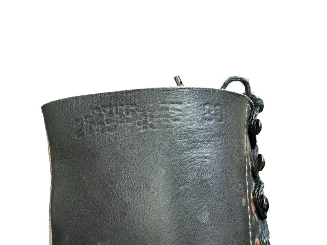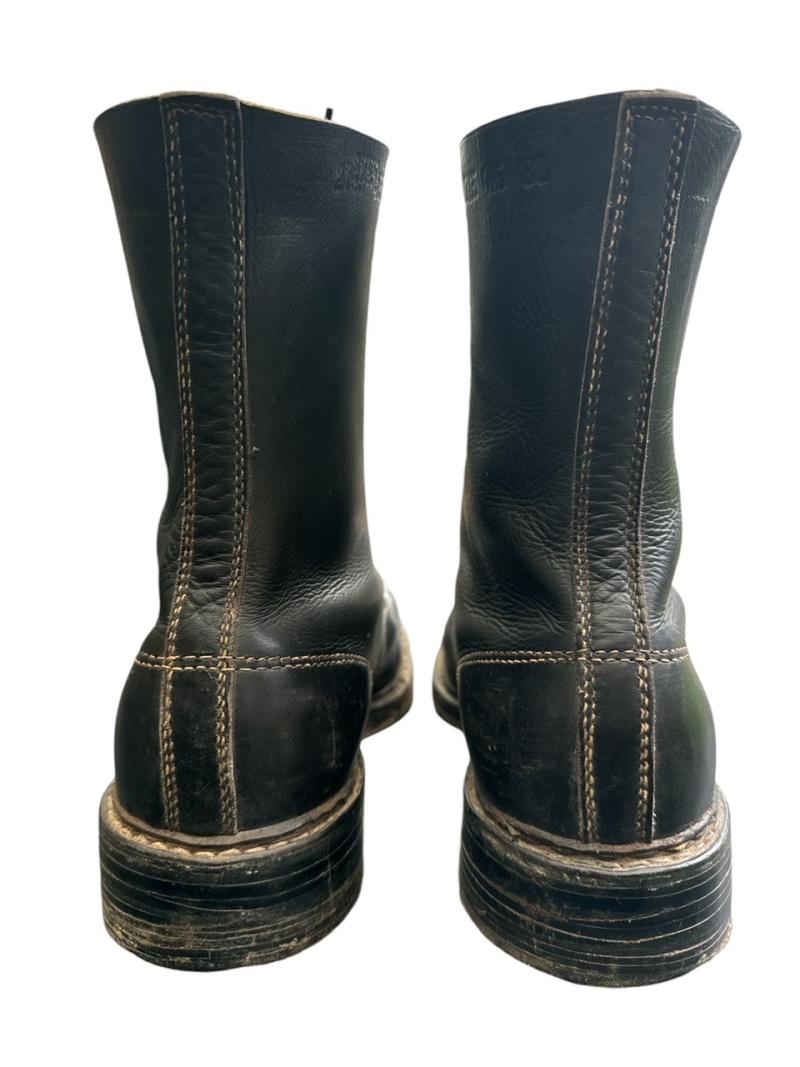 These were the very last type of boots made, with a black leather body, a brown leather lip, and half of the normally round shoelaceholes are changed to hooks!