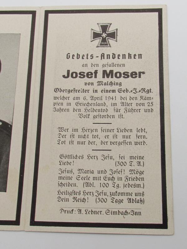 Death Card For A Mountain Troop Soldier Aged 25 This Gebirgsjager (Mountain Troops) was killed in Greece on 6th April 1941 aged 25.