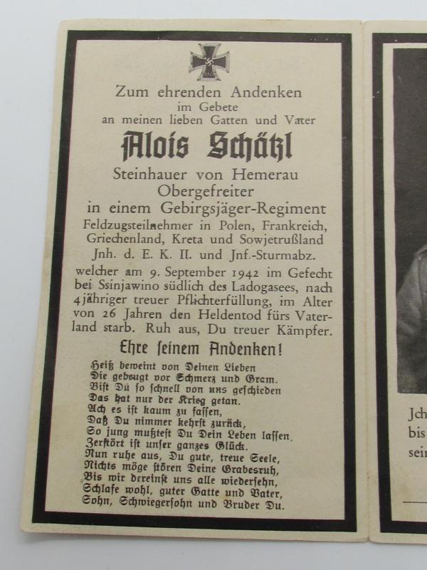 Death Card For A Mountain Troop Soldier This Gebirgsjager (Mountain Troops) was killed near Leningrad ( Lake Ladoga ) on 9th September 1942 aged 24