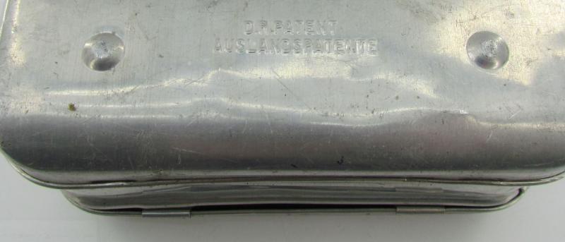 Rare original Wehrmacht Personal "Mica" Kit' (Soldaten Wirtschaftskasten). This kit was stored inside the mess kits and would contain all necessary personal items. The kit is complete with it's original inner frame. The aluminum kit is nicely marked with 'Mica' and nicely 'D.R.Patent, Auslandspatente' marked.