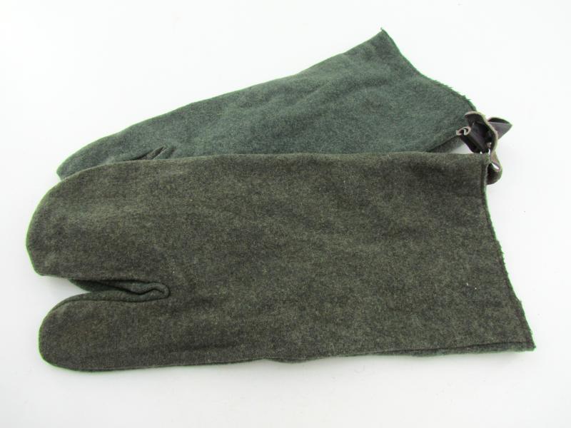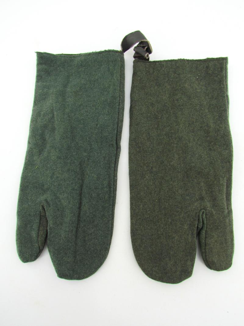 Excellent pair of three-finger gloves, forefinger free to operate the weapon's trigger, made in feldgrau cloth Never been used, perfect condition.