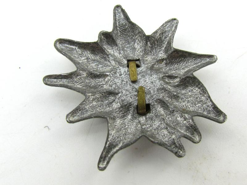 Edelweiss stick pin to put on a visor cap in between the eagle and cocarde to assign it to a GJ-unit. Complete with prongs, unissued