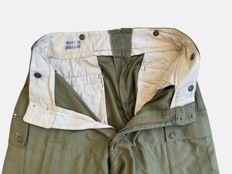 A rare trouser with a highly unique design in a good size - Worn by the 10th Mountain Division, US Army during WW2. Featuring two cargo pockets, two Conmar brand zip-closure waist pockets and a two-button & Talon brand zip fly