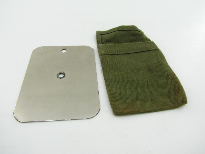 WWII British 1945 dated signal mirror and fabric case. The "mirror" itself is actually a highly polished piece of metal. See the photos but the mirror is marked 1945 " and with a British Broad Arrow. Original green case also included.