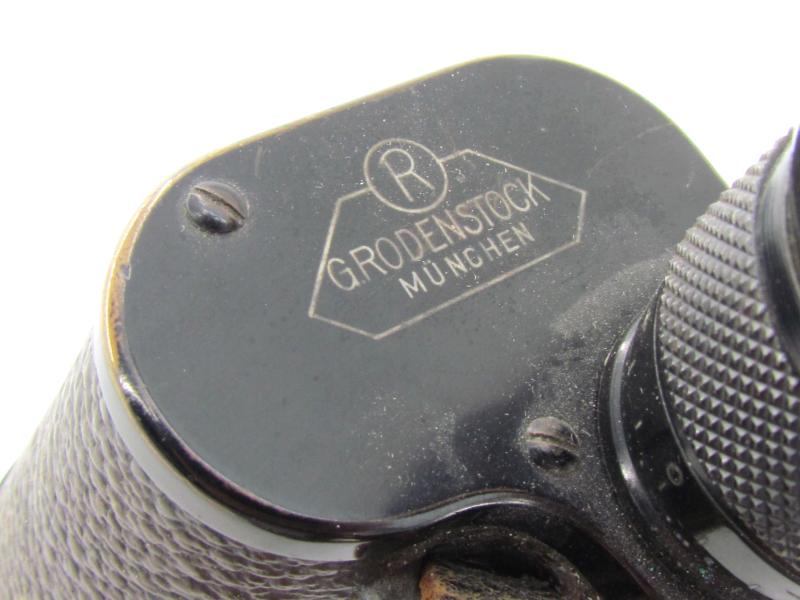 The binoculars are nicely maker marked by the company of 'G. Rodenstock' from München. The binoculars are showing the inscription: 'Dienstglas 6x30' and the unique number '165596'. The binoculars are in good used condition, the optics are clear and complete with reticle (Strichplatte).