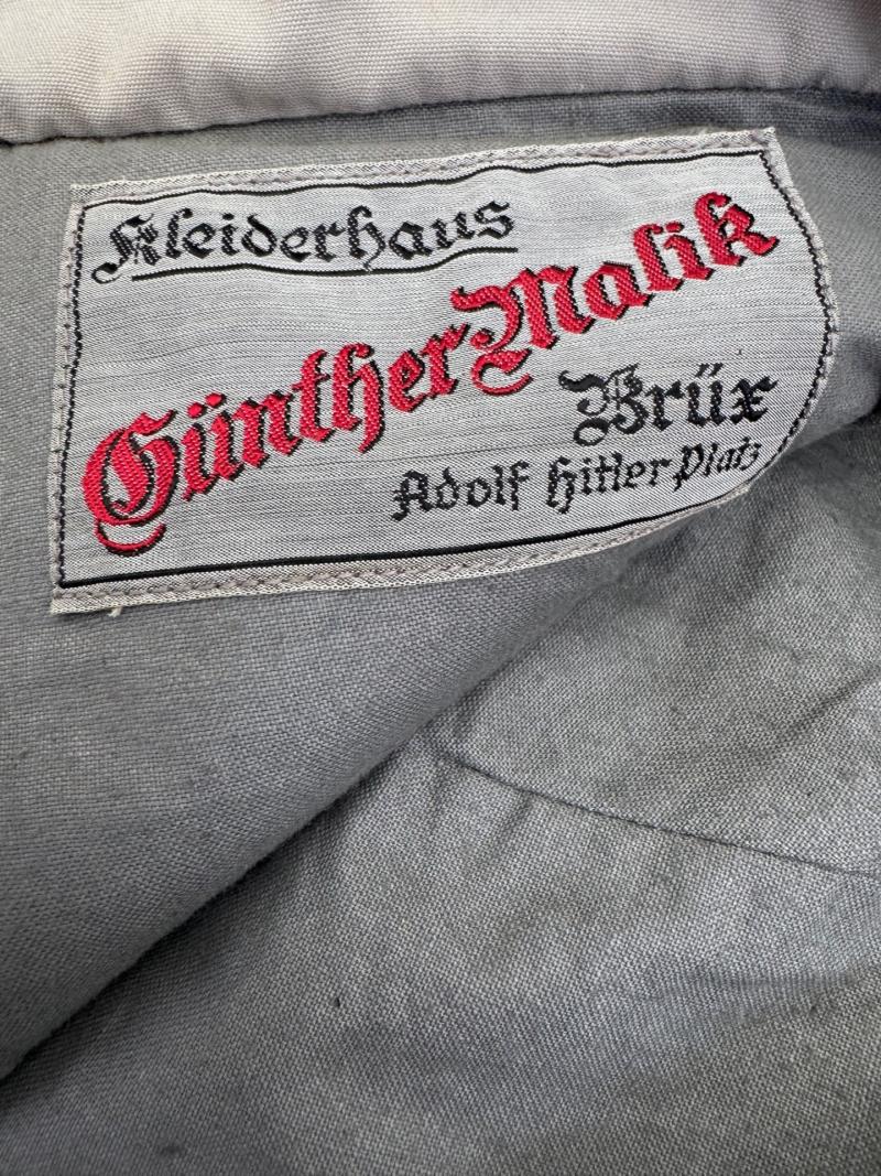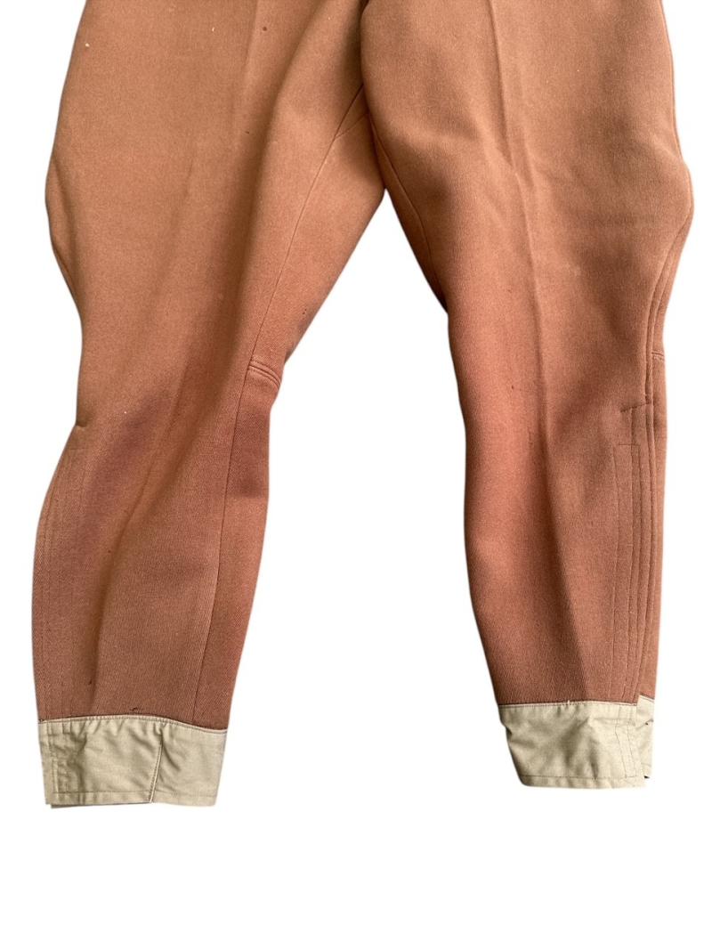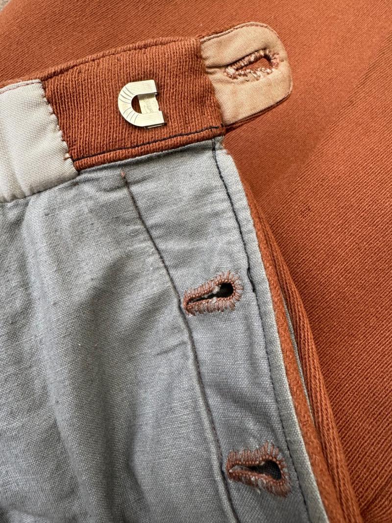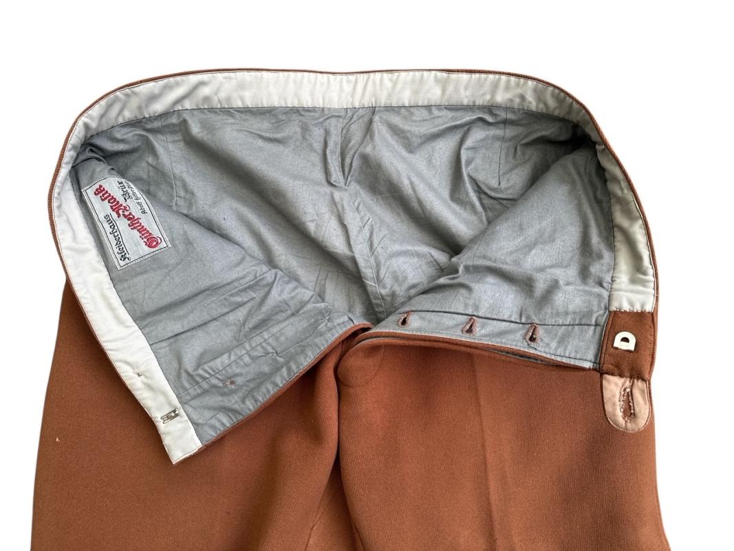 Dark brown boot trousers for a leader (officer) of the Sturmabteilung SA, private purchase, made of fine brown cloth, with 2 slanted pockets at the front and no watch pocket, no back pocket at the back, grey lining inside and tailor's label: "Kleiderhaus Günther Malik-Brüx" and "Adolf-Hitler-Platz", this label can also be seen in the book by Jeff Clark "Uniforms of the NSDAP" on pages 76-77, the trouser legs do not lace up, almost unworn.