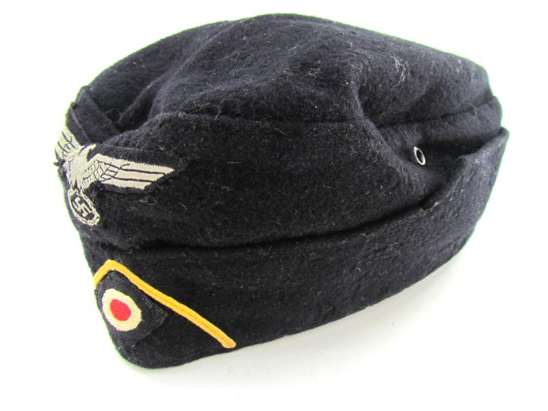 Wehrmacht EM/NCO Panzer Side Cap for "Aufklärung/Reconnaissance" Personnel. Black wool made.Each side has a single enameled ventilation grommet.