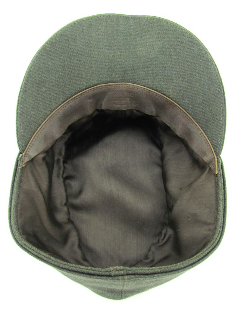 An extremely well-preserved, late-war example of a Waffen-SS Officer’s M43 field cap in field-grey wool, A band of white wool piping trims the outer edge of the crown, in lieu of the silver aluminum wire piping formerly indicating Officer status on earlier Waffen-SS M43 caps factory applied trapezoid insignia on the front