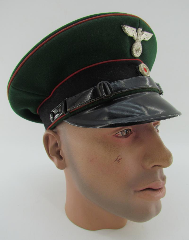 An unusual visor cap from the Third Reich being a prison officers visor cap. All green body, red piping to the crown, red piping to the upper and lower sections of the black centre band.