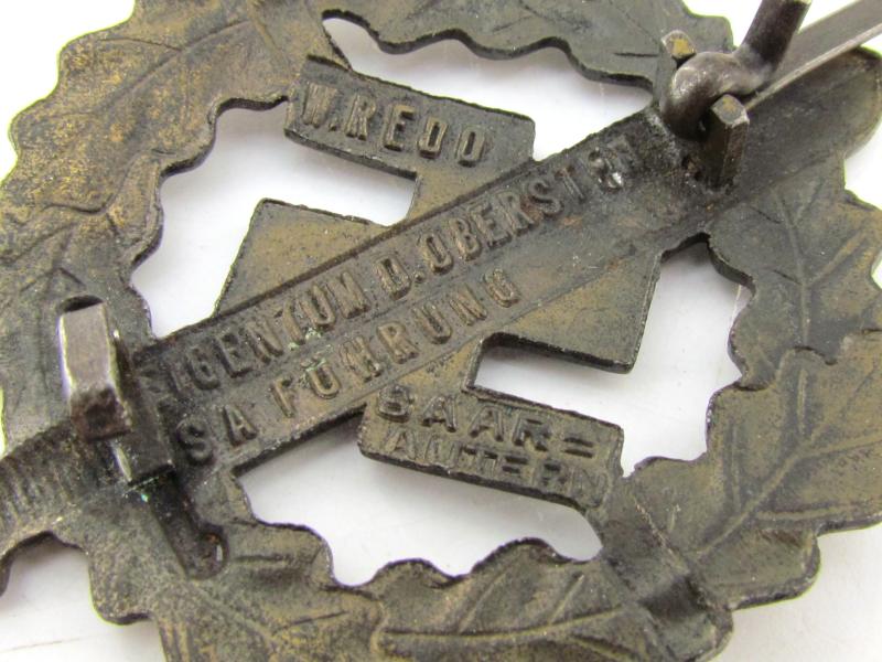 This is a 1939/1945 example marked with the third pattern inscription 'Eigentum d. Obersten S.A.Führung'. The badge is nicely maker marked by the company of 'W.Redo' from Saarlautern.