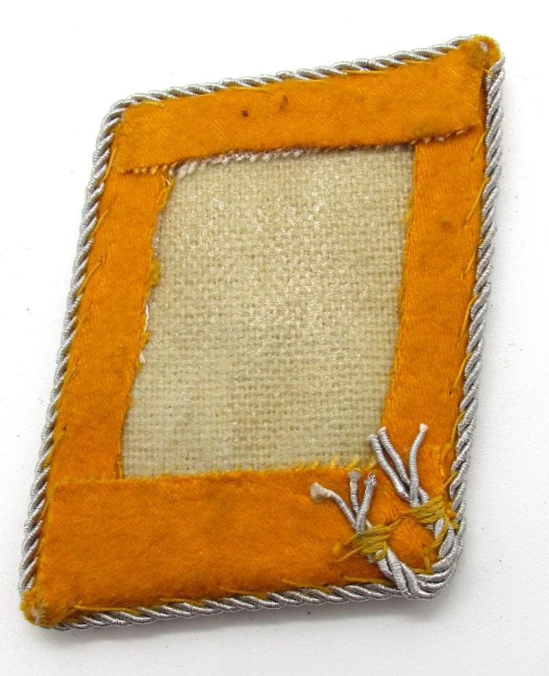 The collar tabs are having the yellow-orange branch-colour (Truppenfarbe) for personnel serving with a flight or paratrooper unit. Wool construction collar tabs with one hand embroidered rank 'gull' above an oak-leaf half-wreath, all in bright silver/aluminum wire threads. The collar tabs are piped with a bright silver/aluminum cord and are mounted on a light tan buckram backing.