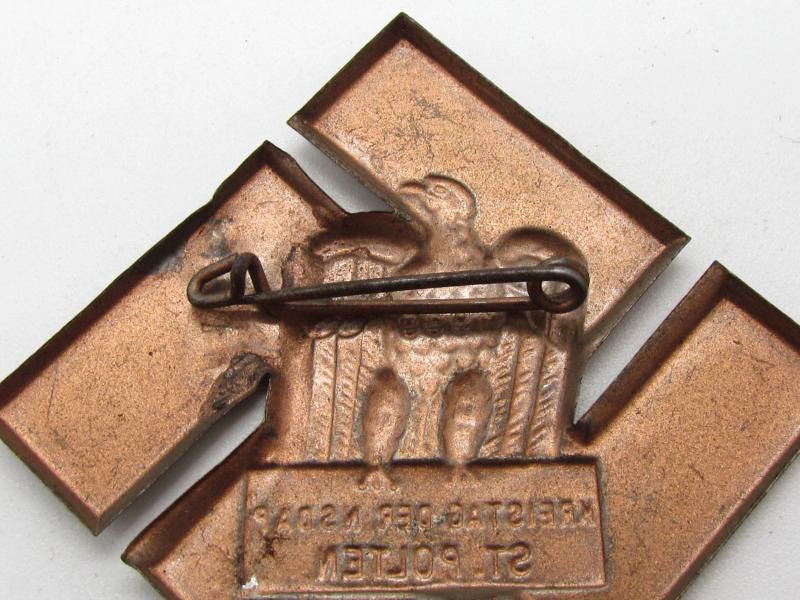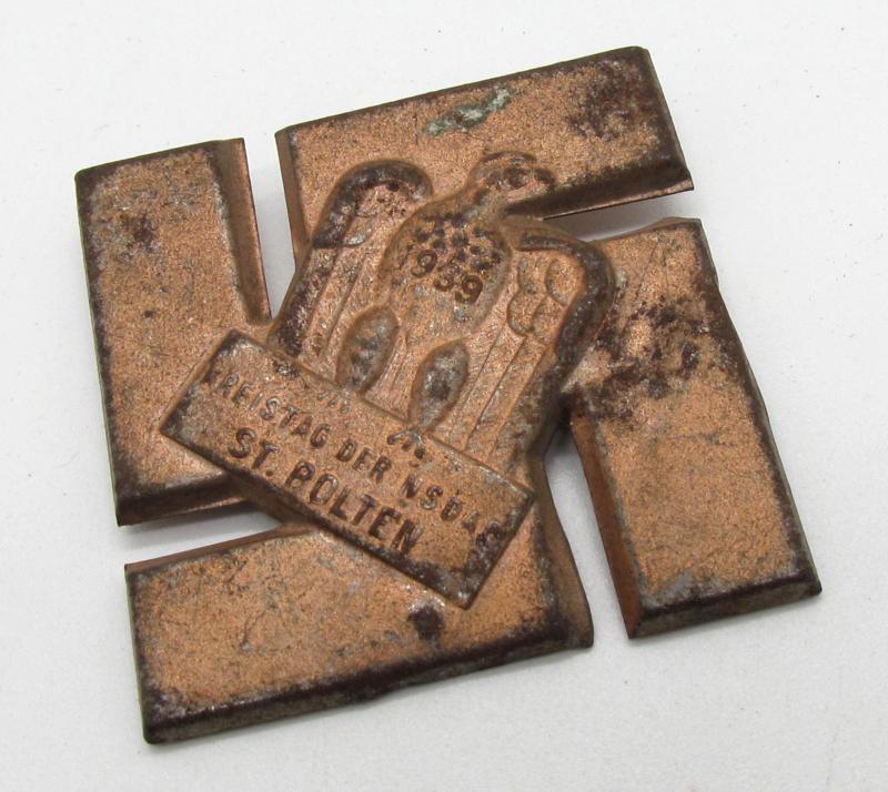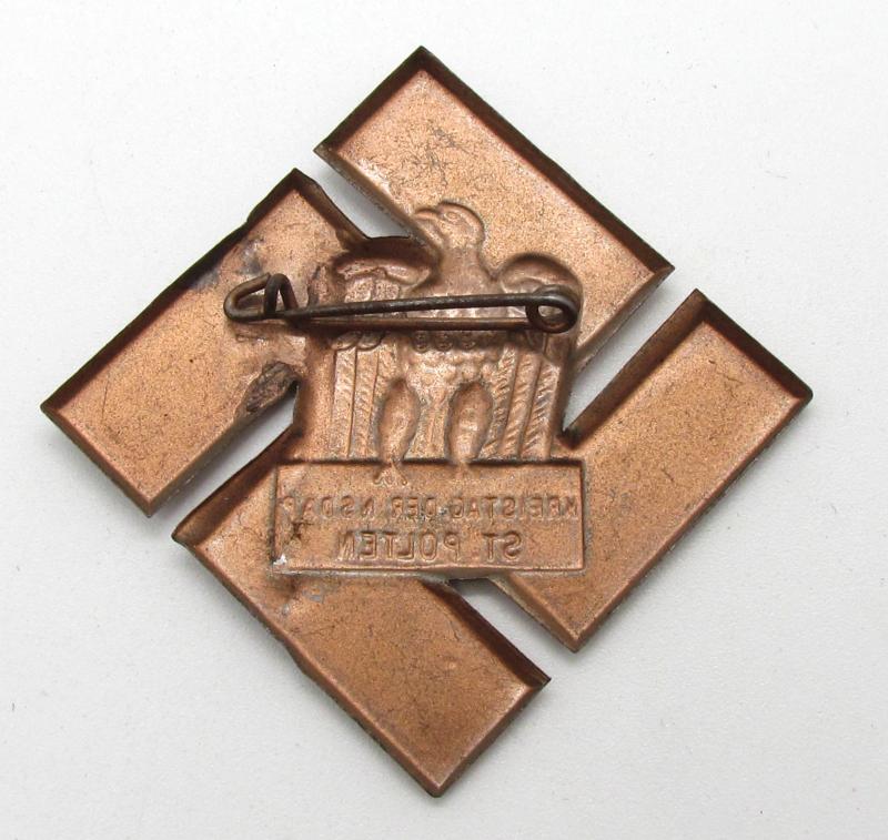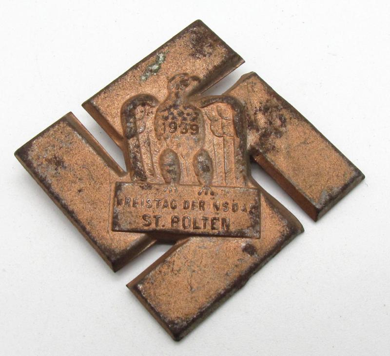 'Kreistag der NSDAP Baden 1939' Tinnie (Veranstaltungsabzeichen) intended for an gathering held in Baden in 1939. The tinnie has a pin-back device to its hollow-back reverse. The tinnie is not visible maker marked. The tinnie is very lightweight, stamped from a thin metal sheet.