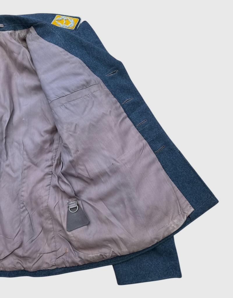 A fine privately tailored Luftwaffe officer’s tunic (Dienstbluse) in blue-grey wool, worn by a Major of the flying personnel or Fallschirmjäger branch, as indicated by the gold-yellow (gelb) waffenfarbe.