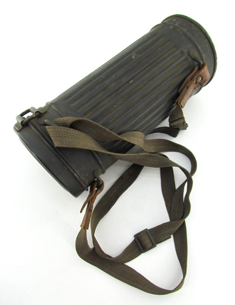 A complete and well-preserved example of the German M30 Gas Mask (Gasmaske M30), complete with its original metal canister in Luftwaffe Blue-grey factory paint. The mask features the typical early-war cloth-covered rubber body, with all straps intact and in a very supple condition