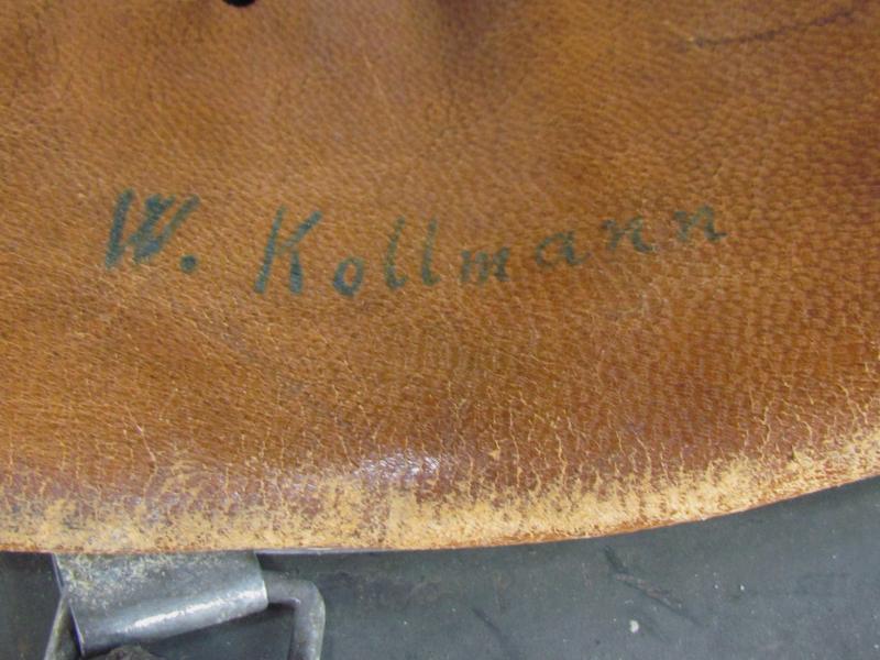 The helmet retains its factory-applied textured field-grey paint, with honest wear consistent with wartime use. Inside is the original M40 liner with untouched leather, named to the soldier “W. Kollmann”, adding a personal touch and extra collector appeal. The chinstrap is also original to the helmet, showing natural age and patina.