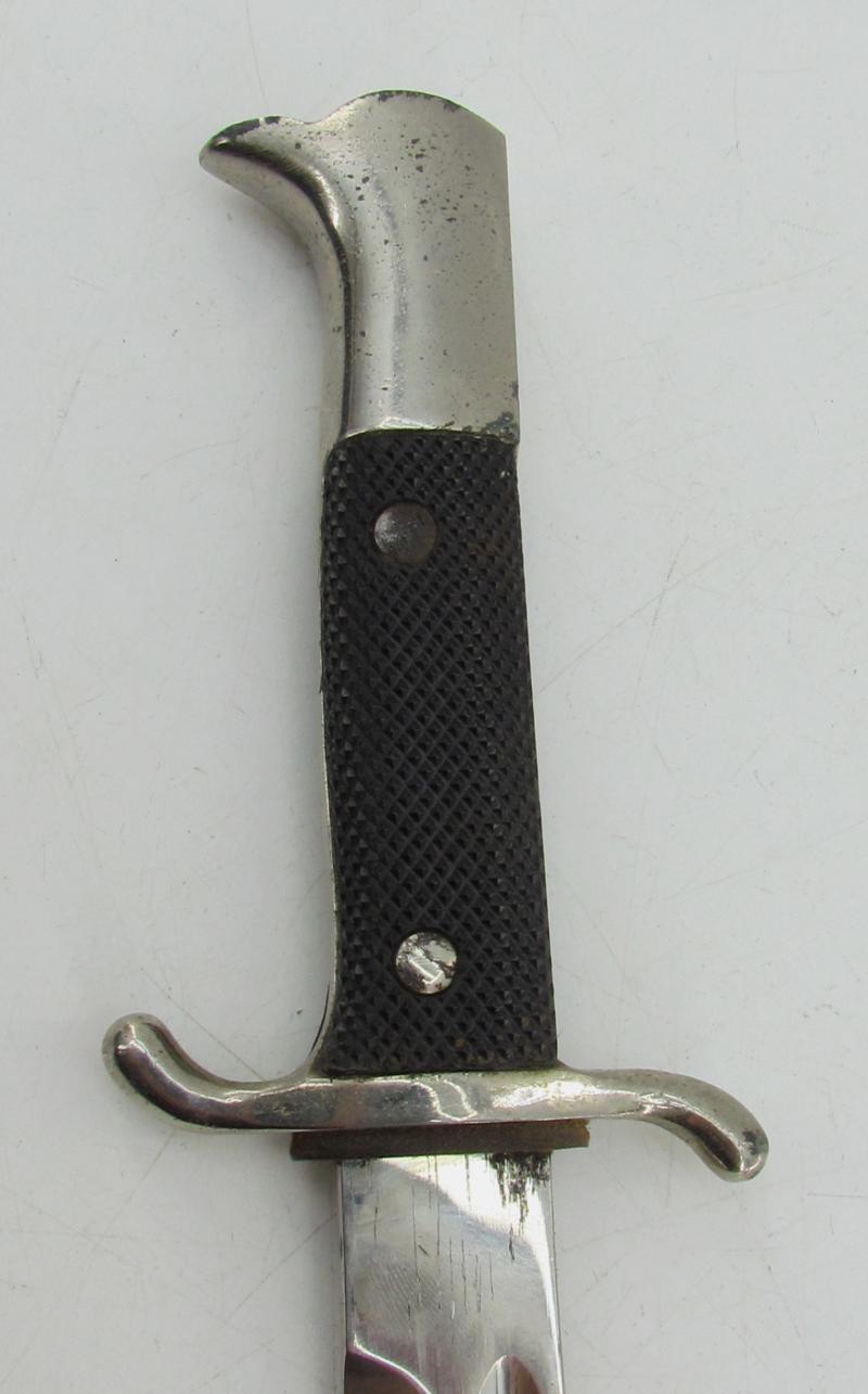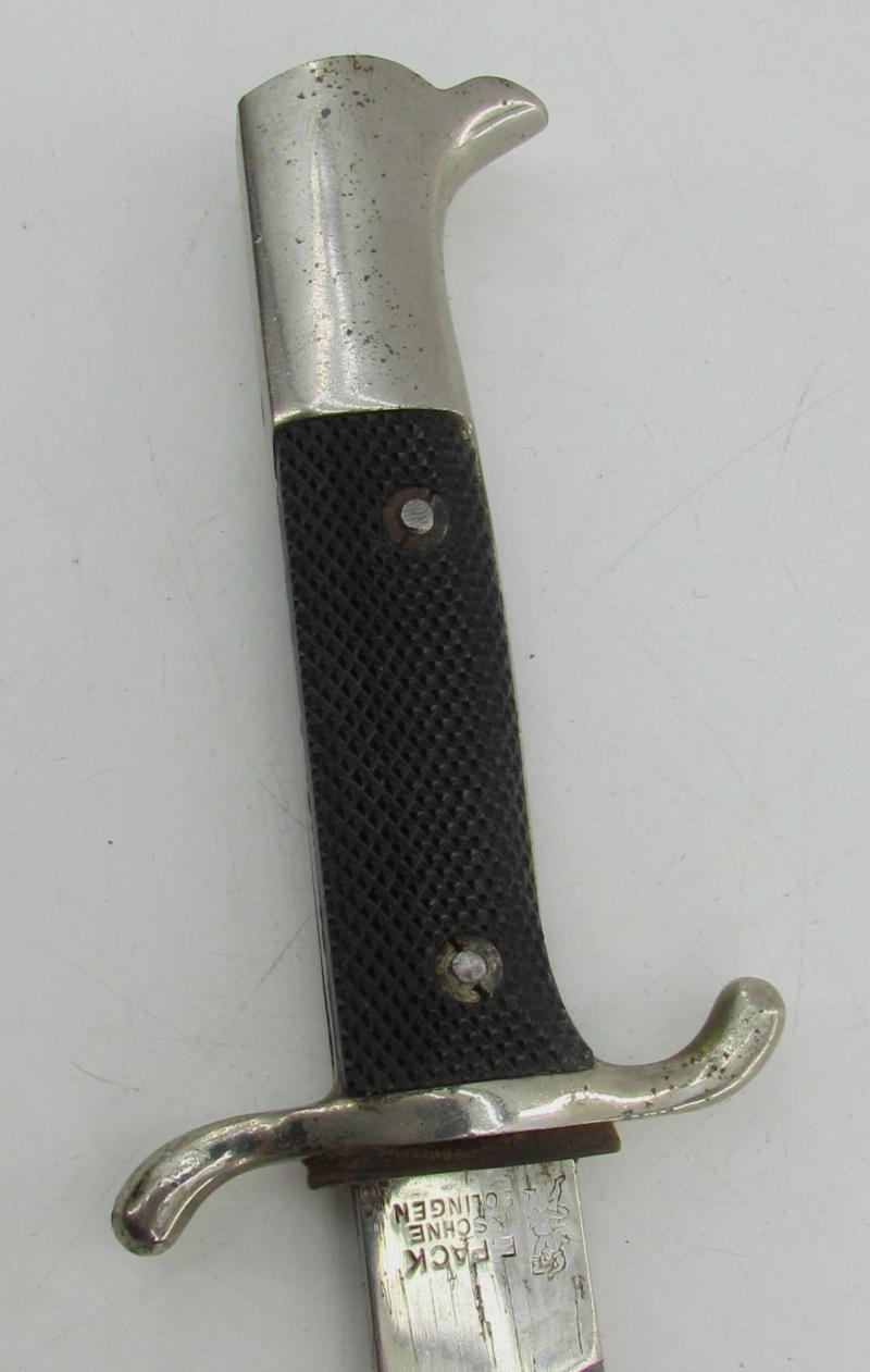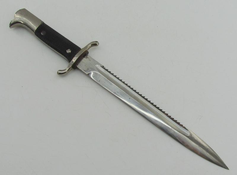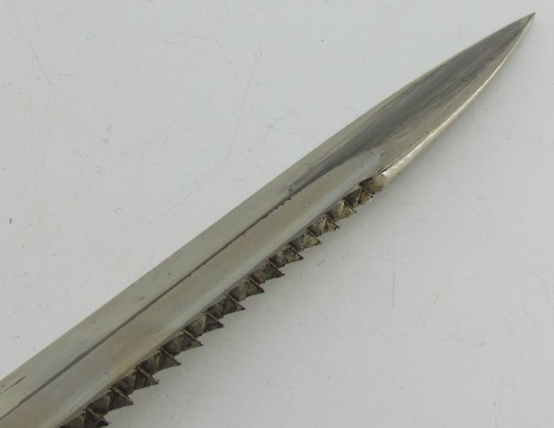 Very rare and hard to find Third Reich dress bajonet for firefighters with sawtooth. Complete with leather belt frog. Maker marked blade by Ernst Pack & Söhne, Solingen.