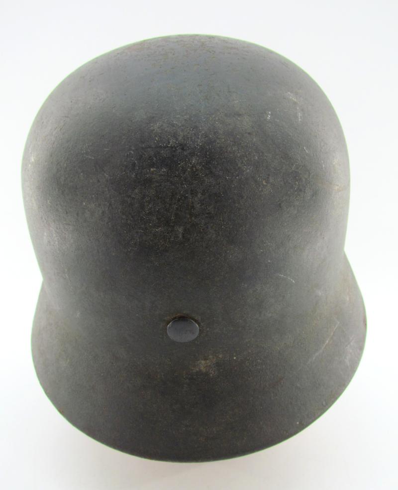 Luftwaffe M40 Single Decal Combat Helmet (Stahlhelm M40). The steel construction M40 helmet retains most of its rough textured, blue-gray paint and about 95% of the decal.