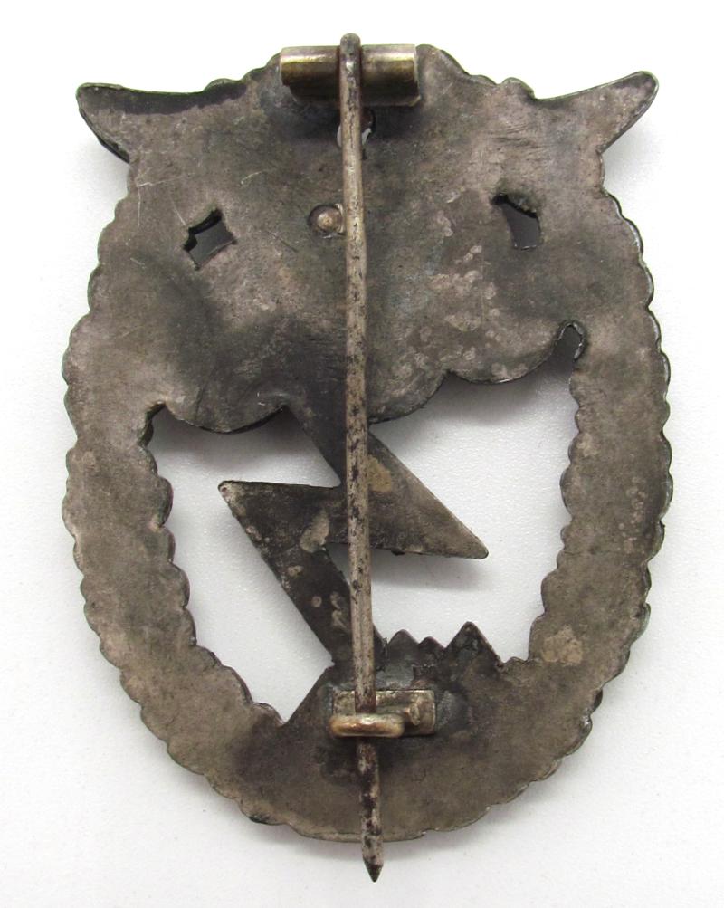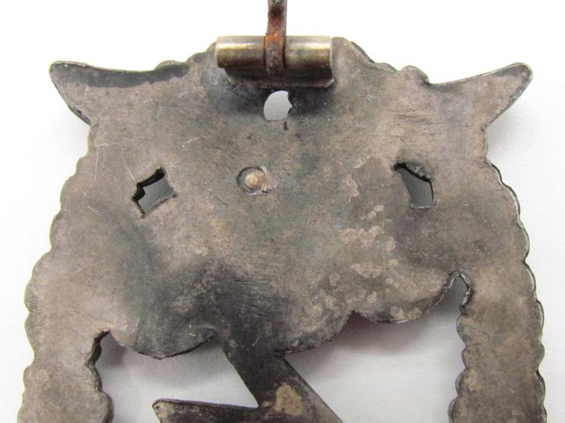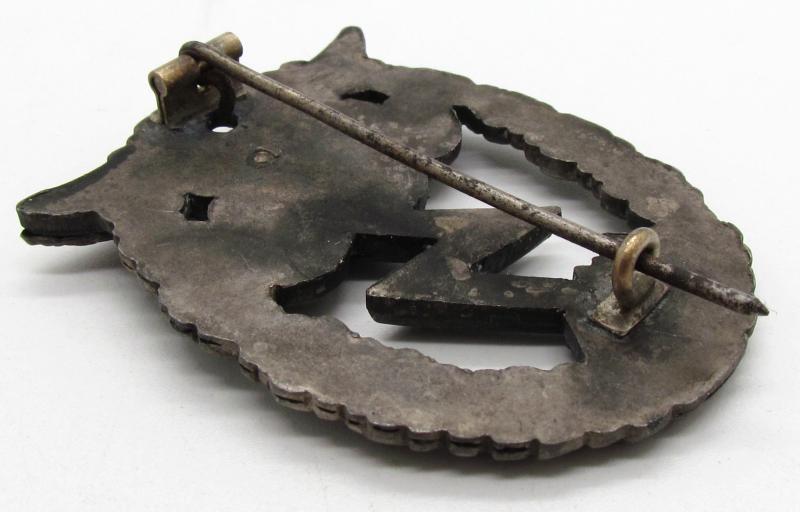 A Luftwaffe Ground Assault Badge, die-stamped two-part construction with the eagle in tombak and the wreath in zink. The reverse of the badge has a vertical pin with a crimped barrel hinge, and a round wire catch soldered on a rectangular base, unmarked by an unknown maker.