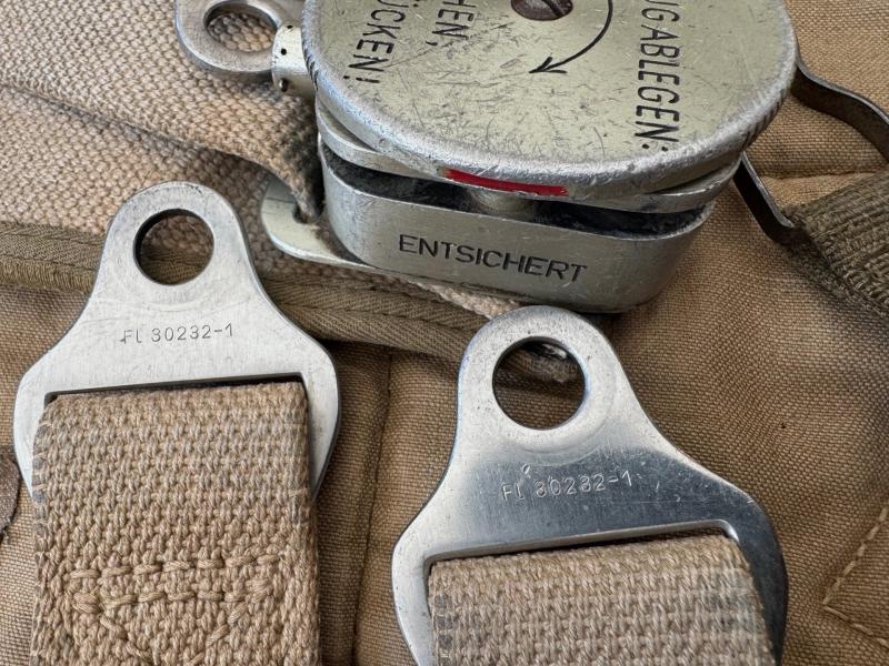 Some small traces of use on the parachute bag, but no through holes in the fabric. Canopy is present and the belt secure/release “clock” is still in working condition.